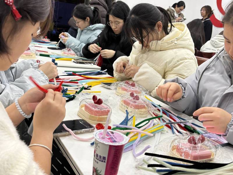 与激光雕刻的现代工艺相呼应的,是活动现场手工制作的扭扭棒花朵。两院学生手持色彩斑斓的扭扭棒,一边交流手工技巧,一边分享学业困惑与生活趣事,在指尖翻折缠绕间,一朵朵栩栩如生的花朵渐次绽放,每一种花型都承载着创作者独特的心境与祝福。